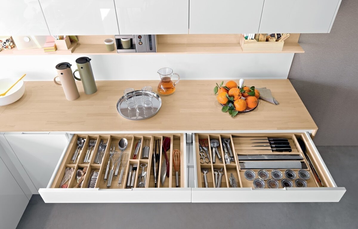 Кухня - это вообще место для сборища разного хлама. При чем весь хлам очень нужный, даже если используется раз в год. Примечательно, что размер столешницы не влияет на размер рабочей поверхности кухни. Даже на очень маленькой, но хорошо продуманой кухне, может быль гораздо больше рабочего места нежели на огромной кухне. Давайте расхламлять. Да , всё нужное! Выкидывать не будем. Начнем с фартука. Не стоит на него навешивать множество держателей для ножей, лопаток и прочей утвари. Всё это гораздо лучше смотрится в верхних ящиках. Фартук лучше задекорировать. На крайний случай- повесьте одну красивую полку для специй. Чай, кофе. Дизайнеры давно придумали как грамотно убрать чайник, кофемашину, сахарницу и т.п. Всё это уходит в отдельный шкафчик. Самый лучший вариант, когда вообще вся техника в одном шкафу. Мыло, тряпки, губки. Ужасно портят внешний вид! Если мыло и средства для мытья полуды можно спрятать под столешницу, вытащив дозатор к мойке, то что с тряпочками делать? Вариантов
