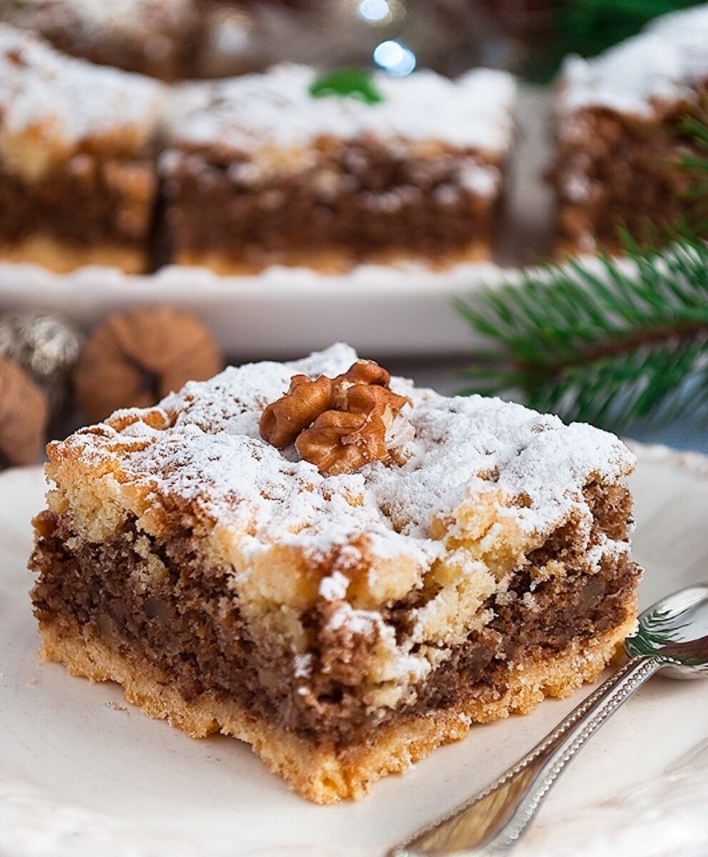 Нам понадобится: Для теста Мука пшеничная - 2 стакана Сахарная пудра - 3 ст л Разрыхлитель - 1 ч л Масло сливочное холодное - 180 г Яичные желтки - 3 шт Холодная вода - 1-2 ст л Соль - щепотка Для начинки Яичные белки - 3 шт Яйца большие - 3 шт Сахар - 1 стакан Грецкие орехи очищенные - 300 г Разрыхлитель - 1/2 ч л Картофельная мука - 1 ч л Соль - щепотка Дополнительно Сахарная пудра - для посыпки Начинаем готовить: Для начала, приготовьте тесто. Просейте муку, сахарную пудру и разрыхлитель через сито. Добавьте соль и кубики холодного масла. Нарежьте ножом крошку. Затем добавьте яичные желтки и холодную воду. Замесите однородное тесто. Разделите тесто на две равные части, оберните каждую в фольгу и уберите в холодильник на 2 часа. По прошествии этого времени, возьмите форму размером 24х24 см или подобную ей. Смажьте форму маслом или застелите пергаментной бумагой. Возьмите одну часть теста и натрите на крупной тёрке. Равномерно распределите получившуюся крошку по дну формы и слегка вда