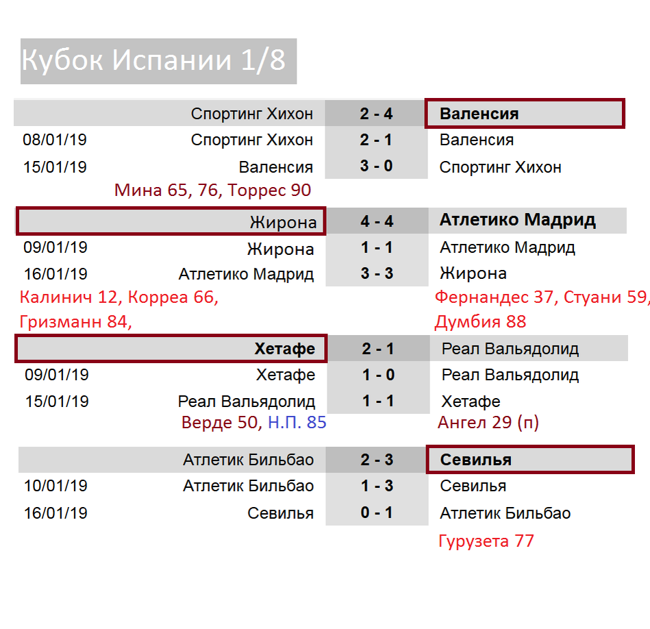 Закончился раунд 1/8 на кубке Испании. Есть сенсации. Давайте по порядку. Валенсия, проиграв в первой игре 2-1, нашла ресурсы и выиграла ответный матч. У Спортинга был один момент, но это никуда не годится. Валенсия прошла с общим счетом 4-2. Напомню, что она, до этого, не могла победить 3 свои игры. Мина сделал дубль. Нахватало его голов, 1,5 месяца он не забивал. У Короминоса Торреса гол и отдана голевая передача в этом матче. Жирона и Атлетико устроили футбольный триллер. Первая игра завершилась вничью 1-1, а в ответной, команды сыграли тоже вничью, но 3-3. И за счет выездных мячей дальше идет Жирона. За весь матч гости нанесли всего 3 удара. Удачно получилось. Надо отметить, что Жирона добыла путевку в самом конце, когда отличился Думбия на 88-й минуте. В итоге 4-4, и Жирона впервые в истории выходит в ¼ кубка Испании, а Атлетико впервые пропускает 3 гола на Ванда Метрополитано. Хетафе - Вальядолид. Это тот самый случай, когда можно сыграть и вничью. Так и произошло, для Хета