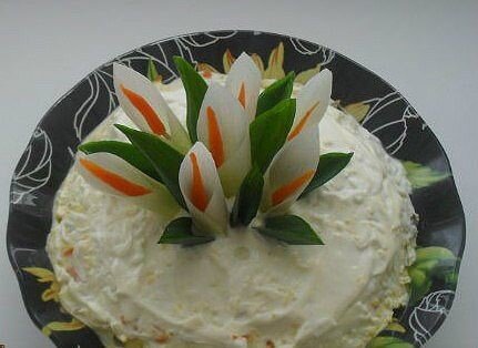 Украшаем салат сделанными цветочками из плавленого сыра, морковки и свежими листиками базилика.