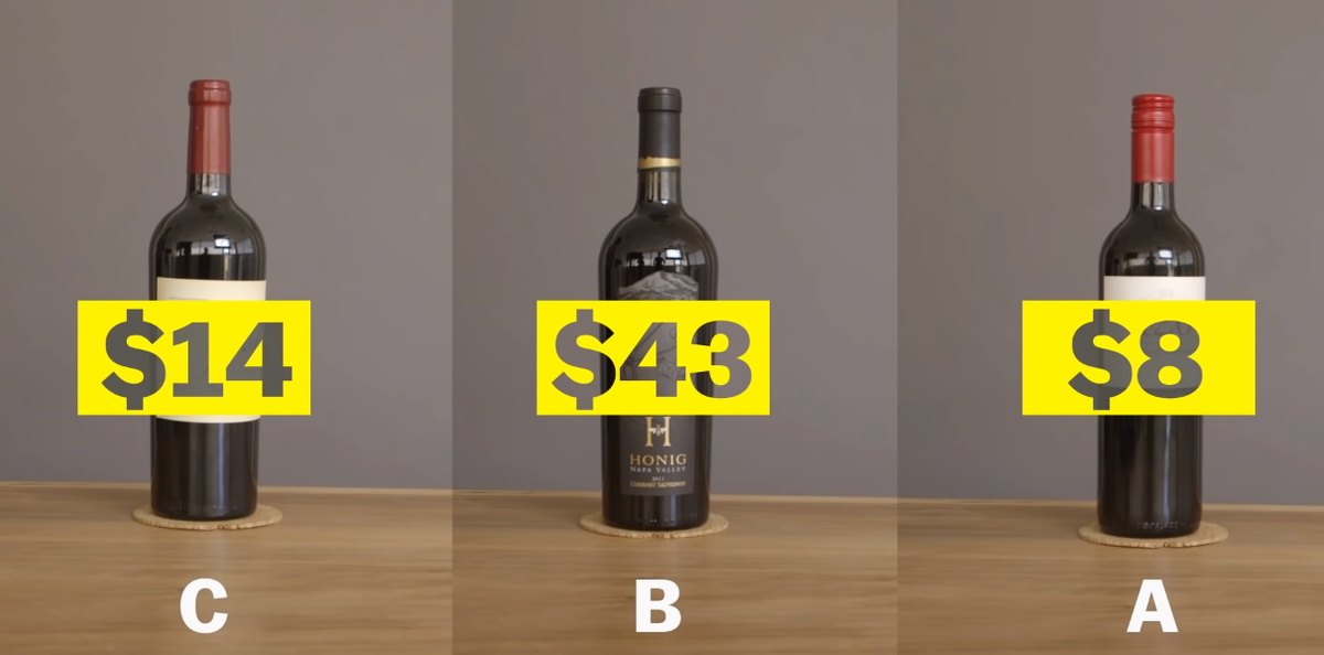 Перед вами три вида красного вина, сделанные из одного и того же винограда: Самое дорогое – это Каберне Совиньон 2011 года из Долины Напа. Винные журналы оценили его, как выдающееся. И оно стоит в 5 раз дороже, чем вино справа. Но неужели оно в 5 раз вкуснее? 19 редакторов Vox продегустировали эти 3 вина и почти половина из них смогли корректно определить, какое самое дорогое, но не потому, что оно им больше понравилось: средняя оценка самого дешевого и самого дорого вина оказалась одинаковой: Это вполне согласуется с исследованием 2008 года, в котором собраны результаты 6175 дегустаций вслепую. Оно показало, что, не смотря на пройденное обучение сомелье, люди не начинали любить дорогие вина, наоборот, они нравились им даже немного меньше. Кажется в винах могут запутаться даже профессионалы. Вот почему даже 1 фильм может пошатнуть весь винный рынок: после выхода фильма «Sideways» в 2004 г, герои которого хвалили сорт вина Пино Нуар и ругали Мерло, продажи первого значительно выросли,
