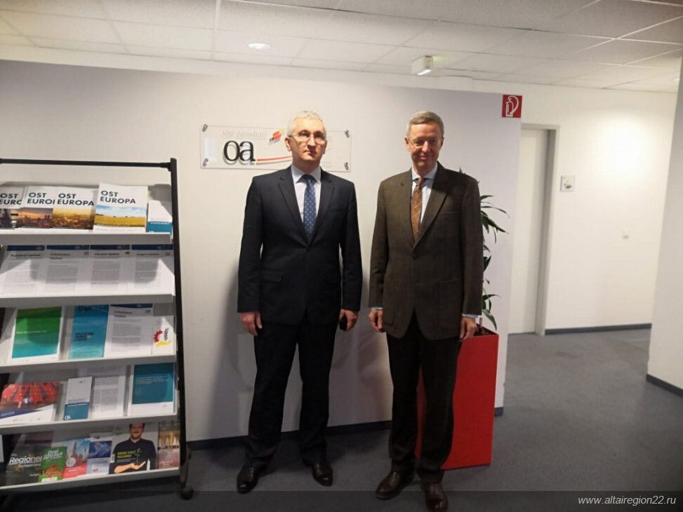 В Германии продолжает работу делегация Алтайского края под руководством заместителя Председателя Правительства края Виталия Снесаря. Руководитель делегации провел переговоры с Уполномоченным Федерального правительства Германии по делам переселенцев и национальных меньшинств, председателем германской части Российско-Германской Межправительственной комиссии по вопросам российских немцев Берндом Фабрициусом. Во встрече также приняли участие глава Немецкого национального района Эдуард Винтер и представитель общественных объединений российских немцев региона - директор Фонда поддержки этнических немцев «Алтай» Александр Штейнбек. В ходе встречи была продолжена дискуссия по вопросу создания в Алтайском крае культурно-делового центра российских немцев, основной целью которого станет не только сохранение культуры, традиций и обычаев российских немцев, но и проведение мероприятий, направленных на развитие экономических связей с деловыми кругами Германии. Виталий Снесарь и Бернд Фабрициус также
