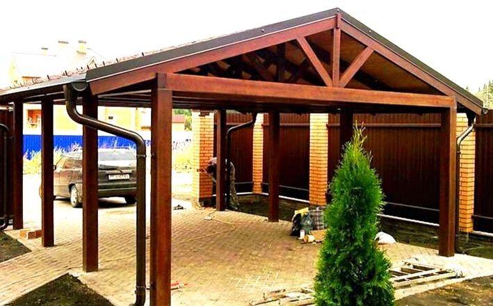Добрый день! Продолжаем строить своими руками, и переходим от построенной беседки, переходим к не менее важной постройке, это навес для своего железного коня. Навес под наш автомобиль, это простая надежная постройка, которая спасет наш автомобиль от дождя или града, да и на солнышке краска сильно выгорает. Опять же можно если возникла поломка, на сухом месте под крышей поставить на ноги своего коня. Единственное чем отличается навес, это размером и материалом. Самый распространенный материал, это дерево или металл. Работа с металлом требует определенного навыка, да и в большинстве случаев, еще и сварочный аппарат нужен, а варить не каждый умеет. Но если все таки надумали построить из металла, после завершения хорошо обработайте и покрасьте краской по металлу, что бы избежать коррозии. А вот из дерева, я думаю каждый сможет построить красивый навес, который будет гармонировать с домом, если правильно все рассчитать. Материал из дерева, у многих остается от постройки дома, бани или бес