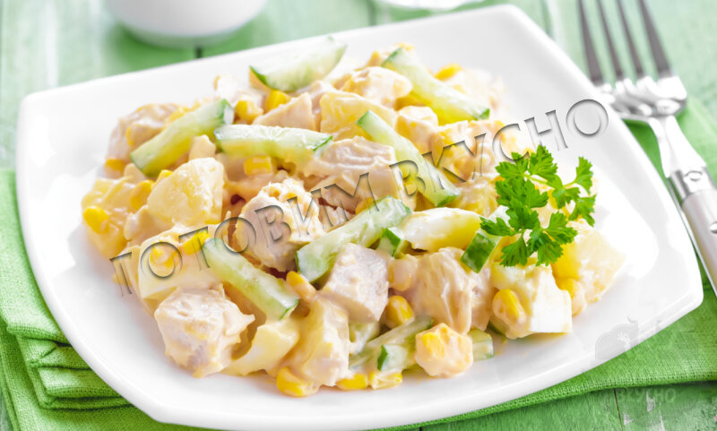 Иногда так хочется чего-нибудь вкусненького, но чаще всего это нечто очень быстро откладывается на боках и портит фигуру. Мы предлагаем вам вариацию полезного и нежного салата, который обязательно оценят худеющие лентяйки. Ничего сложного в приготовлении этого роскошного блюда нет! Если вы следите за фигурой, но не представляете салаты без заправки, то в конце статьи найдете 4 рецепта домашнего майонеза! Продукты: ананасы - 205 гр; куриное филе - 1-2 шт, в зависимости от размера; свежий огурец - 1 шт; кукуруза консервированная - 110 гр; натуральный йогурт, соль, зелень, лимонный сок - по вкусу; зелень для украшения. Способ приготовления: 1.Режем ананасы небольшими кубиками, огурчик соломкой, отварную курочку крупными кусочками. Все соединяем вместе в емкости для салата. 2.Вводим кукурузу, предварительно слив жидкость. Делаем соус, соединяя йогурт с солью, лимонным соком. Заправляем салат, декорируем зеленью. Понравилось? Подпишись! Обещанный рецепт Домашнего майонеза для вас здесь!