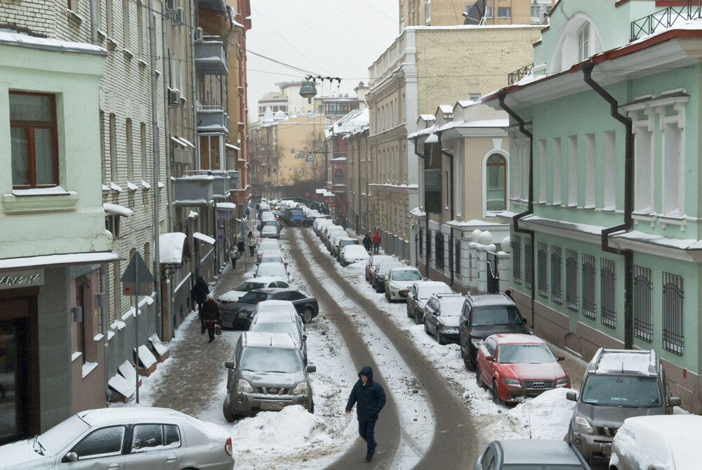 Стоим на возвышении, что занимала Церковь Рождества Христова в Палашах, после замененная на карте города музыкальной школой. Белой лентой разворачивается под нами Большой Палашевский переулок.