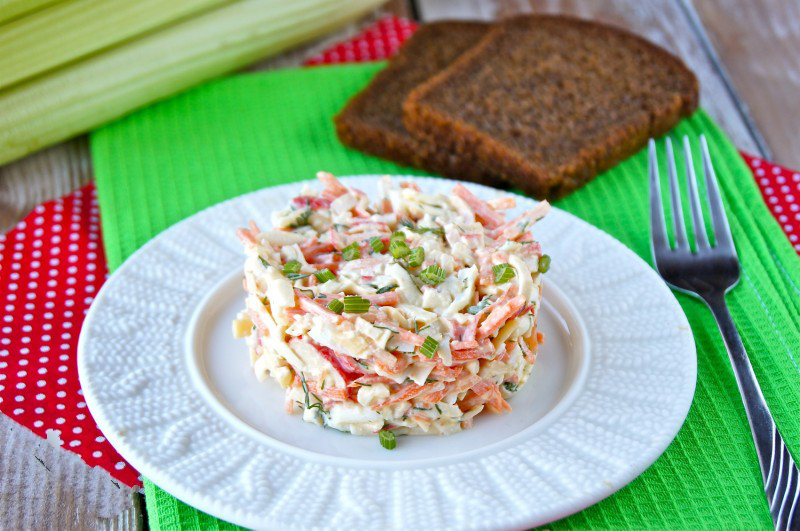 Главная особенность этого рецепта в его доступности: продукты в составе довольно недорогие и доступные. К тому же, он прост в приготовлении, а значит, долго возиться на кухне не придется. Потребуется: Итак, готовим: 1. Первым делом отварить и остудить яйца. Корейскую морковь измельчить. В ее классическом исполнении она не впишется в салат. Выложить в общую посуду. 2. Крабовые палочки нарезать на небольшие кусочки. 3. Сыр натереть на средней терке. Лучше использовать несколько видов сыра. Прекрасный вариант - сочетать колбасный с любым видом твердого. 4. Яйца измельчить ножом или при помощи терки. 5. Зелень помыть и нарезать, чеснок измельчить. Добавить майонез, посолить. 6. Все перемешать. Салат готов! Приятного аппетита!