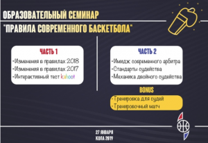 27 января 2019 года в спортивном зале физкультурно-оздоровительного комплекса в г. Кола по адресу: пр. Защитников Заполярья, д. 3, пройдет семинар на тему: "Правила современного баскетбола". Семинар будет разделен на два блока: 1. Образовательный семинар - изменения в правилах 2017, 2018, трактовка правил. 2. Судейский семинар - стандарты и механика судейства. Спикерами семинара выступят: судья РФБ - Мананков Сергей; председатель судейской коллегии Федерации баскетбола Мурманской области - Уханов Михаил; президент Федерации баскетбола г. Мурманска - Мананков Артем. Источник