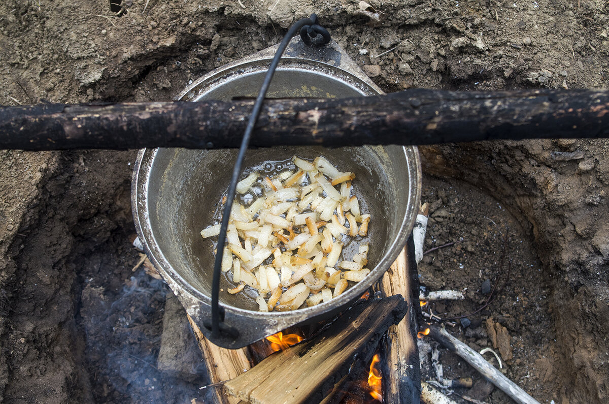 При таком температурном режиме, когда даже днем столбик термометра не поднимается выше +6, на первое место выходит питание. Пища должна быть калорийной и жирной. Отшельник с грустью взглянул на свои припасы. Что же есть у него поесть? Булка хлеба, несколько картошин, небольшой шмат сала и грамм сто домашней лапши. Мда, на таком пайке не зажиреешь. Но жить можно. И отшельник взялся за приготовление. Леший никогда не ел такие блюда, где в воде плавало бы сало. Но выбирать не приходится. Первым делом вскипятил в чайнике 3 литра воды и отставил в сторону. Порезал сало на мелкие кусочки и закинул в казан. Пока сало превращалось в ошурки, мелко порубил лук и морковку, которые закинул перед тем, когда ошурки были вот-вот уже почти готовы. По лагерю забродил невероятный аромат. И когда лук с морковкой были готовы, залил это водой из чайника А сам в это время очистил одну картофелину и, мелко порубив, отправил её в варево. Очень хорошо, что он не забыл с собой прихватить хоть немного зе