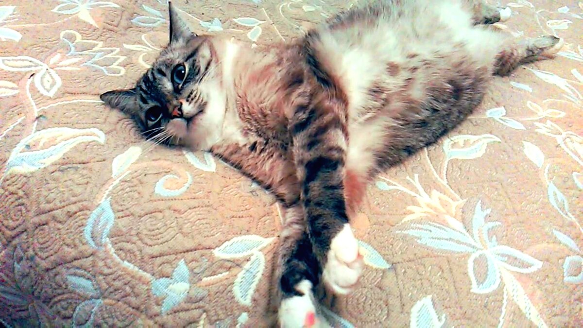 Кот Беляшик лежит и не может свернуться калачиком. Хочет, но не может - мешает брюхо. Строго требует у меня перестать его закармливать.