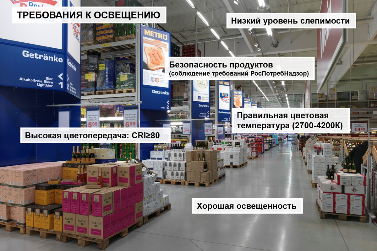 По качеству света требования к освещению торговых залов у Магнита следующие: