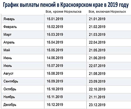 График выплаты пенсий в 2019 году в вашем регионе вы можете посмотреть на сайте Пенсионного Фонда. Он уже опубликован и почти не отличается от графиков предыдущих лет. Ниже в статье смотрите график выплат пенсий по Красноярскому краю. Все полагающиеся выплаты пенсий и пособий будут перечисляться в соответствии с этим графиком. Некоторые уже получили свои выплаты заранее в конце декабря 2018 года. Это коснулось тех граждан, чьи выплаты приходились на праздничные новогодние каникулы. Все остальные получат свои выплаты согласно установленного графика. График выплаты пенсий в Красноярском крае в 2019 году. С 1 января 2019 года пенсии неработающих пенсионеров будут проиндексированы на 7,05%. Какой станет ваша пенсия после индексации вы можете вычислить сами. Для этого надо нынешнюю пенсию умножить на 0,0705. Например, пенсия сейчас составляет 11 770,53 руб. После индексации она увеличится на 829,82 и составит 12 600,35 руб. На сайте ПФ РФ размещена подробная информация об изменениях