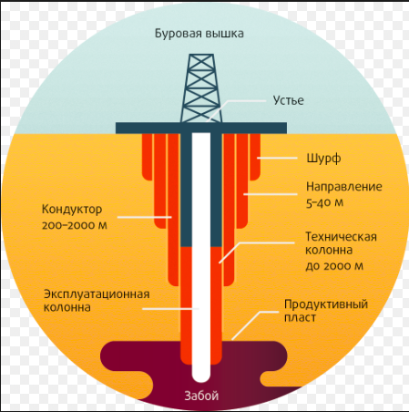 Конструкция скважины выбирается на этапе проектирования и должна отвечать следующим требованиям: - конструкция должна предоставлять возможность свободного доступа к забою геофизических приборов и глубинного оборудования; - конструкция должна не допускать обрушения стенок ствола; - стенки ствола скважины должны обеспечивать надежное разделение друг от друга всех проходимых пластов и не допускать перетекания флюидов из пласта в пласт; - в случае необходимости, конструкция этой выработки должна давать возможность герметизировать её устье в случае возникновения такой необходимости. Строительство и монтаж нефтяных и газовых скважин проводится следующим образом: - Первым делом бурится начальный ствол большого диаметра. Его глубина составляет около 30-ти метров. Затем в пробуренное отверстие опускается металлическая труба, которую называют направлением, а окружающее её пространство уставляется специальными обсадными трубами и цементируется. Задача направления – предотвратить размывание