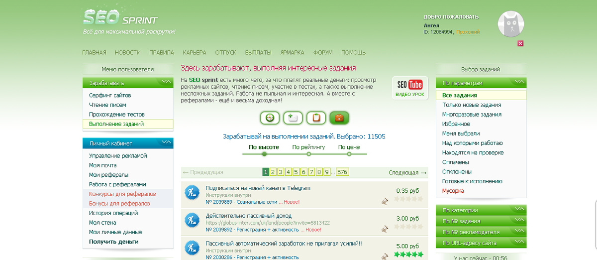 Очень старенький и стабильно платящий букс Сео спринт. Наверное каждый начинающий зарабатывать в интернете человек, прошёл через популярный, с большими выплатами и проверенный временем сайт Сео спринт. На нём можно зарабатывать на сёрфинге, чтение писем, прохождение тестов и выполнение заданий. Так же как в принципе и во всех интернет заработках есть реферальные программки, при помощи который можно значительно увеличить свой заработок. Задания на этом буксе не сложные в интернете полно видео обзоров как проходить те или иные задания. Если ты ещё не зарегистрирован на сайте сео спринт, то проходи по ссылочке и регистрируйся. в регистрации ни чего сложного нет: http://www.seosprint.net/?ref=12084994