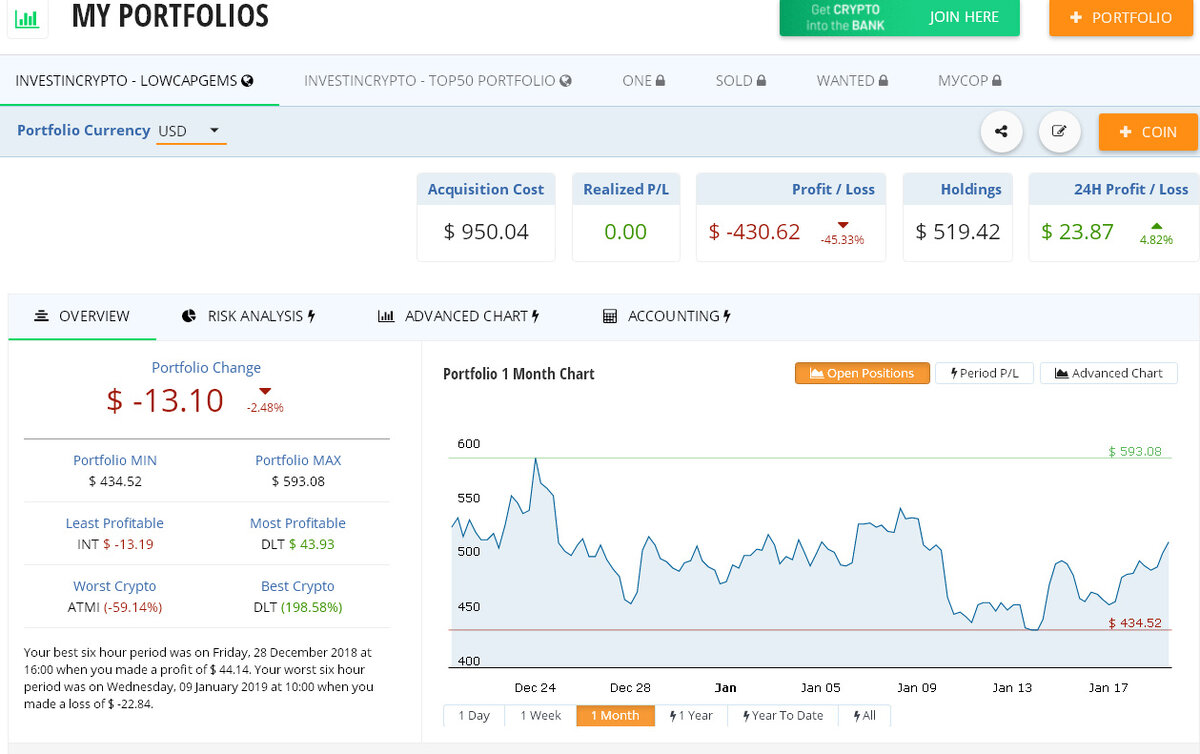 Если вы владеете только биткойнами, то состояние ваших криптоинвестиций отслеживать крайне просто. Находите текущую цену BTC, умножаете ее на число монет – и наслаждаетесь результатом. Если же в вашем портфеле десятки криптовалют, то удобные инструменты для мониторинга инвестиций становятся настоятельной необходимостью. Мне довелось попользоваться несколькими онлайн-сервисами и мобильными приложениями для этих целей. Вкратце расскажу об их преимуществах и недостатках. Cryptocompare.com Это для меня основной инструмент наблюдения за криптоинвестициями в динамике. Удобный сервис, работающий во всех браузерах для настольных ПК и смартфонов. Поддерживает несколько портфелей, между которыми просто переключаться. Баланс отражается в цифровом и графическом виде. Можно выбирать, в какой валюте отображаются активы: не только в долларах, евро или рублях, но и в биткойнах, эфирах или золоте. Для всех активов в портфеле сразу видна цена покупки, текущая цена, изменение цены за сутки, а также пр