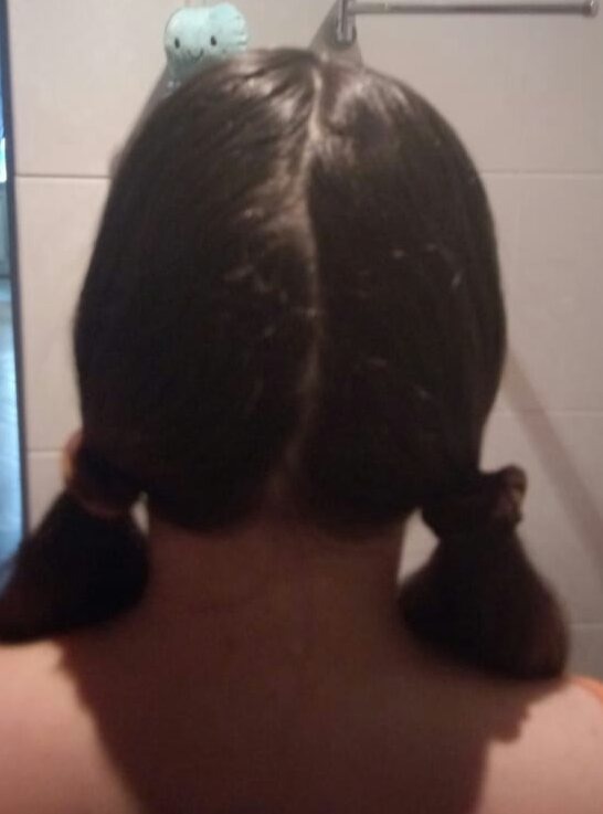 Как известно, концы волос необходимо регулярно обновлять. Ведь по ним сразу можно понять об их здоровье. К тому же секущиеся концы выглядят не эстетично. Поэтому такой маленький нюанс, как регулярное обновление кончиков волос делает более привлекательным внешний вид любой стрижки. Но не всегда бывает время или желание дойти до парикмахерской. У кого-то возможно и финансы не позволяют. А ведь каждому все равно хочется иметь ухоженные волосы и у себя, и у ребенка. Поэтому данный мастер-класс поможет и научит как самостоятельно в домашних условиях обновить концы волос. И главное как это сделать ровно. Причем техника настолько проста, что с этим справится любой человек, даже тот, кто ни разу не держал в руках ножницы. Для этого понадобится несколько резинок для волос (количество зависит от длины волос), расческа с тонким хвостиком и парикмахерские ножницы. Итак, для начала необходимо разделить волосы на две половины. Удобнее это делать именно тонким хвостиком расчески. Затем каждую поло