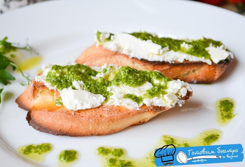 Для соуса из базилики: 1. Чеснок — 1 зубчик. 2. Базилик (только листья) — 1 большой пучок. 3. Кедровые орехи (слегка подсушенные в духовке) — 100 гр 4. Натертый на мелкой терке сыр Пармезан — 100 гр Приготовление горячих тостов с соусом из базилика: 1. Положить для приготовления блюда половинку дольки чеснока в блендер или в ступку. 2. Растереть чеснок в однородную массу с базиликом и кедровыми орехами. 3. Затем получившуюся массу перемешать с сыром и добавить немного оливкового масла. 4. В духовке подсушить ломтики хлеба. 5. Натереть сухарики оставшейся частью чеснока и сбрызнуть напоследок оливковым маслом. 6. Сверху положить готовы