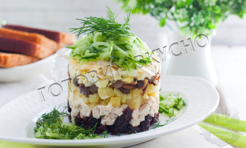 Вкусные и оригинальные салаты всегда пользуются популярностью как за обычным ужином, так и за праздничным. Несложные рецептуры и недорогие продукты дают возможность тем не менее создать настоящий шедевр. Данный салатик вы можете создать как на одном блюде, слоями, так и подать порционно - по желанию. Если вы предпочитаете что-то более легкое и полезное, то в конце статьи вы найдете рецепт немецкого салата с гранатом! Продукты: чернослив - 170гр; отварная курица - 260 гр; картофель - 3 шт; шампиньоны - 120 гр; сыр - 150 гр; огурец свежий - 2 шт; майонез и соль по вкусу; зелень для украшения. Способ приготовления: 1.Промываем чернослив, он должен быть мягким, можно ошпарить его горячей водой. Рубим и выкладываем на дно салатника. Слегка промазываем майонезом этот и все последующие слои. 2.Затем идет слой грудки, которую режем кубиками, картофеля. Для следующего слоя нужно обжарить шампиньоны. сверху натираем сыр на крупной терке. Самый верхний слой - огурец нарезанный либо тонкой со