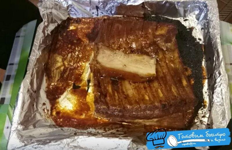 5. Хорошо промаринованное мясо вместе с соусом выкладываем на противень, застеленный фольгой