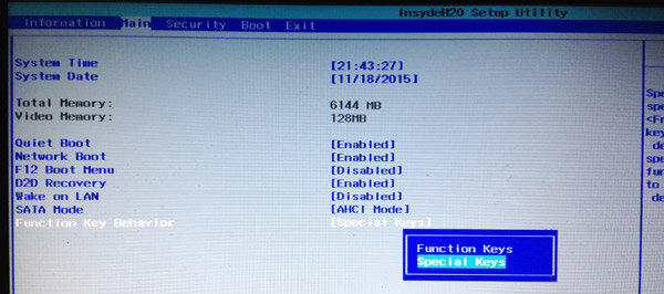 В меню "Main" биоса, выбираем "Function key behavior" и меняем значение на "Function keys".