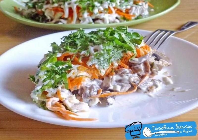 Иногда надо что-то быстро приготовить на завтрак или на ужин, как основное или дополнительное к основному блюдо. На эту роль вполне подойдёт салат "Мельник". Ингредиенты для салата "Мельник": Шампиньоны (соленые или маринованные) — 450 гр 2 средние луковицы Масло растительное — 30 мл Сыр Ламбер — 300 гр Майонез — 300 гр Филе куриной грудки — 700 гр Соленый огурец — 2-3 шт Яйца — 4 шт Морковка — 1-2 шт Картофель — 2-3 шт Приготовление салата Мельник: Отвариваем куриное филе, остужаем, затем нарезаем маленькими кубиками. Варим 4 яйца, морковь и картофель — остужаем. Ингредиенты выкладываем в салатницу: 1 -й слой: Соленые грибы нарезаем, выкладываем. 2-й слой: Репчатый лук нарезаем и обжариваем на растительном масле, затем выкладываем в салатницу. 3-й слой: От обжаренного репчатого лука растительное масло выливаем третьим слоем. 4-й слой: Тертый сыр ламбер. 5-й слой: Майонез. 6-й слой: Нарезанное отварное куриное филе. 7-й слой: Соленый огурец (крупная терка). 8-й слой: 1 вареное яйцо по