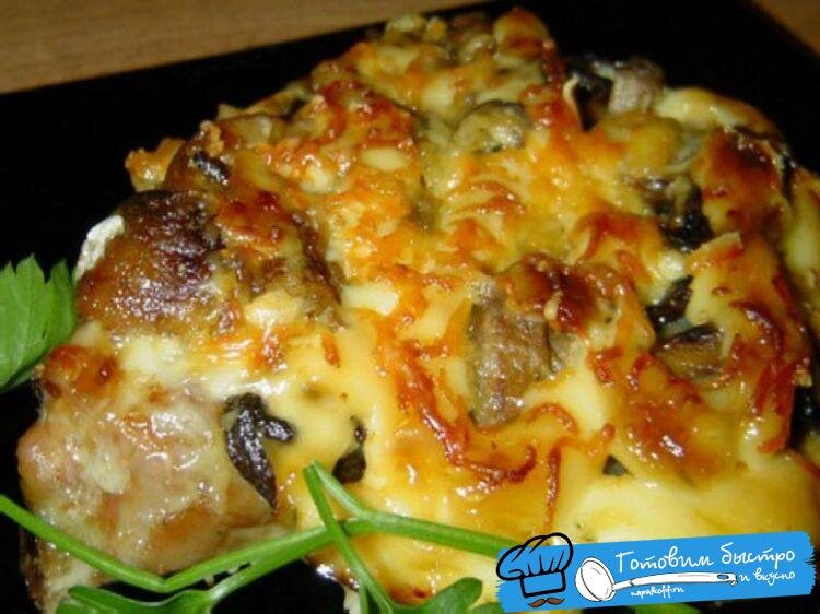 Куриные отбивные под грибной шубой- изысканное блюдо для гурманов. Сочные и нежные отбивные под грибной шубой можно подать как отдельное блюдо, а можно и как добавление к гарниру. Куриные отбивные хорошо сочетаются с картофельным пюре, рисом и гречкой. Это блюдо можно будет быстро приготовить и любому торжеству. Продукты для приготовления куриных отбивных под грибной шубой: 4 отбивных из куриной грудки (небольших); 100 гр. Шампиньонов; 100 гр. маложирного твердого сыра; Соль; Перец по вкусу; Немного зеленого лука; Лимонный сок. Приготовление куриных отбивных: Духовку разогреть на 180-200 градусов. Подготовленное мясо слегка отбить гладкой стороной молоточка. Отбивные натереть солью, перцем, сбрызнуть лимонным соком, переложить на противень. Грибы отварить до готовности, остудить. После охлаждения грибы мелко порезать и выложить их на противень поверх куриных грудок. Твёрдый сыр натереть на крупной тёке и посыпать сыром поверх грибов. Поставить в духовку на 15 минут. Подавать сразу ж