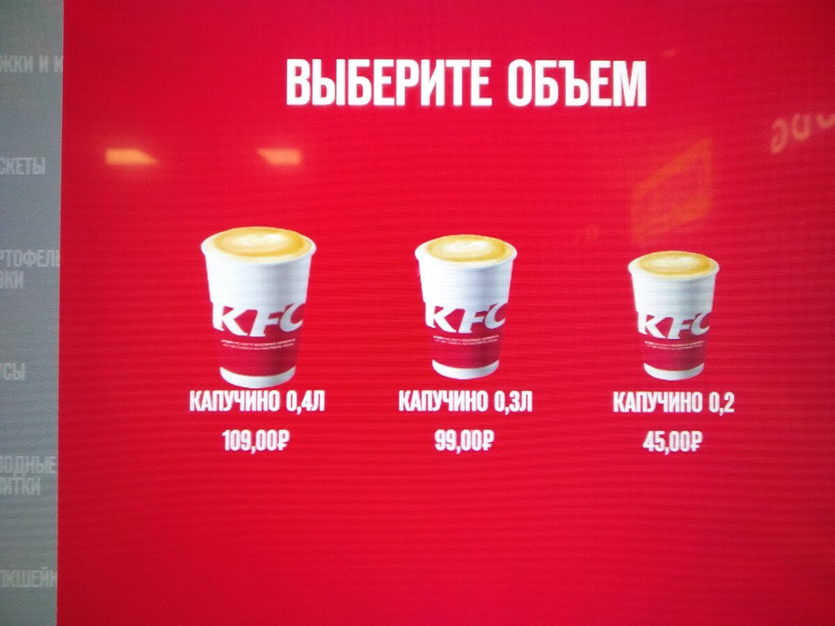 Как часто мы заходим в разные кафешки перекусить и выпить горячего кофейку и все это происходит в таком быстром темпе, чтобы долго не задерживаться и поскорее поскакать по своим делам к любимому котику , что даже не присматриваемся к разнице цены к объёму. Зайдя недавно в один из известных сетевых фастфудов, имея в кармане всего пару смятых бумажек, оставшихся у меня от похода по магазинчикам ( это же святое))), я очень замёрзла и проголодалась, захотелось скушать что-нибудь вредного и выпить кофейку. Случайно, по причине того, что за душой у меня ни гроша в последнее время, я пригляделась к экрану, чего раньше я никогда не делала. Вас ничего не смущает на фото? Мне предлагают на выбор три варианта: за 45 рублей объём 200 мл за 99 рублей объём 300 мл за 109 рублей 400 мл. По обычной логике если объём покупаемого товара увеличивается, то стоимость единицы продукта уменьшается. Даже если политика ценообразования не подразумевает скидки за больший объём, то цена должна расти хотя бы п