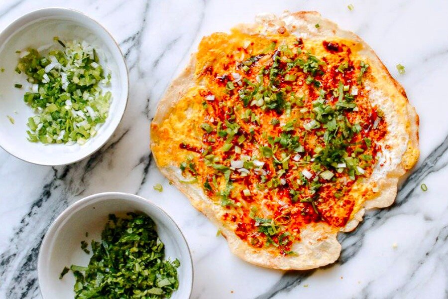 Яичные блинчики — традиционное уличное блюдо. Обычно в продающих их лавочках работаю в паре. Один раскатывает и печет блины, другой собирает готовый блин и берет деньги. Тесто раскатывают на металлическом столе. Дома для этого отлично подойдет каменная столешница или силиконовый коврик. Приготовление блинчиков и дополнения к начинке в разных местах будут слегка отличаться, но основные компоненты тесто, яйцо, салат, зеленый лук и бобовый соус одинаковы. Ингредиенты: 170 г – муки ½ стакана – теплой воды 4 шт – яйца 2-3 стрелки – зеленого лука 5-6 веточек – кинзы (по желанию) 4 листа – салата ромэн соус доубаньцзян сладкий бобовый соус Тяньмяньцзян чили масло жареные семена кунжута растительное масло Приготовление: Где я беру соусы, пасты, приправы … для блюд китайской кухни Приятного аппетита! Если вам понравилось, поставьте 👍, чтобы понимать предпочтения участников канала и быть более полезным. Если вам интересна данная тема подпишитесь на канал "Китай на вкус".