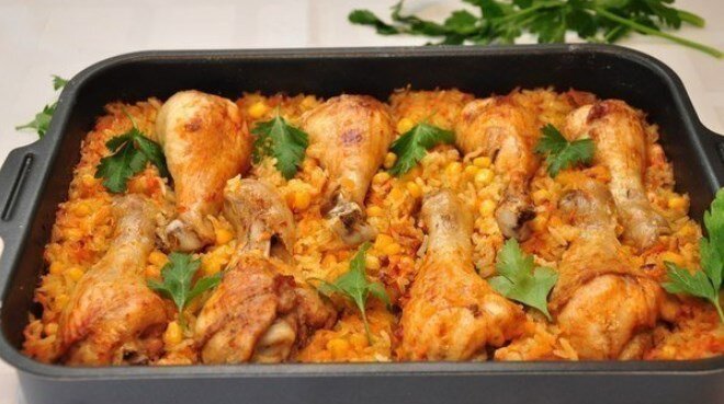 Очень часто готовлю это блюдо на ужин.Вся семья в восторге! А самое главное что готовится такой ужин очень просто, и не отнимает много времени. Для приготовления нам потребуется: Голени кур— 1 лоток Морковь сырая — 2 шт. Лук репчатый — 2 шт. Консервированная кукуруза — 1 банка Рис (я беру длиннозёрный пропареный ) — 1 стакан (200 мл) Кипяток (можно куриный бульон) — 500 мл Соль Перец, паприка (по вкусу) Рафинированное подсолнечное масло ПРОЦЕСС ПРИГОТОВЛЕНИЯ: Для начала необходимо очистить лук и морковь. Лук режим мелкими кубиками как на "зажарку", морковь трём на крупной тёрке. Лук и морковь соедините в сковороде, предварительно добавив в неё немного подсолнечного масла. Обжарьте до слегка золотистого цвета. С кукурузы слейте всю жидкость и добавьте её к луку и моркови. Затем добавьте промытый рис и хорошенько всё перемешайте. Необходимо чтобы рис пропитался маслом. После чего залейте всё 2 стаканами кипятка (или бульона). Переложите полученную "смесь" в форму для зап