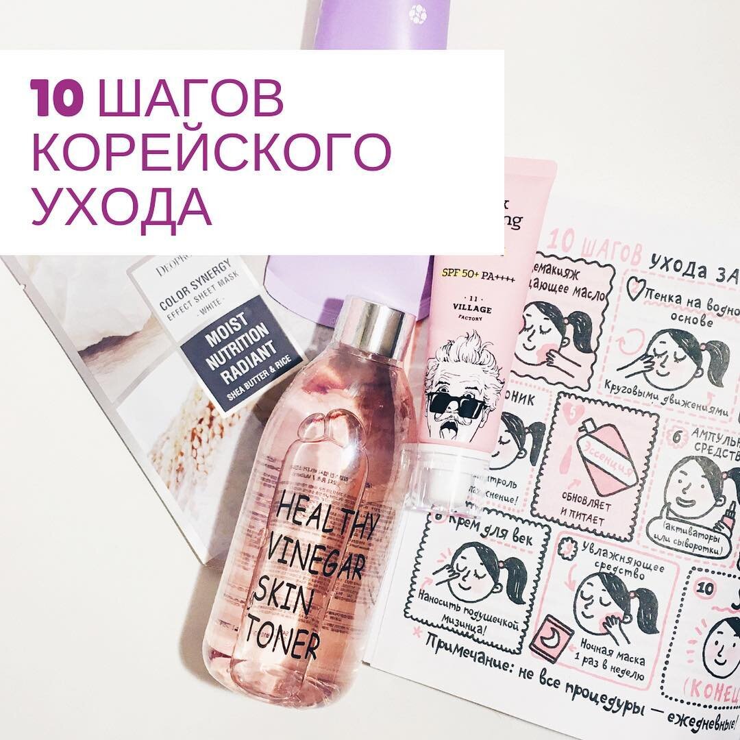 19.01.2019 10 шагов корейского ухода за кожей лица Корейская косметика продолжает активно привлекать к себе много интереса, но вот информации о секретах красоты по-корейски все еще мало. Буду исправлять эту ситуацию) Самый главный секрет красоты и молодости кожи скрыт в десятиступенчатом уходе, с него сегодня и начнем. Первое, что стоит отметить – не нужно бояться такой весомой цифры 10. Да, шагов действительно 10, но они не ежедневные и не все из них обязательные! 1 шаг – очищение кожи от макияжа. На этом этапе используются такие средства, как: гидрофильное масло, ремувер, очищающие кремы, щербеты. Задача – очистить кожу от макияжа и жирорастворимых загрязнений. *Если вы не наносили макияж, солнцезащиту, не выходили на улицу и не занимались физ.активностью, можете пропускать этот этап. 2 шаг – очищение кожи от водорастворимых загрязнений. Подойдут пенки, гели для умывания на водной основе. Задача – очистить кожу от остатков макияжа и пыли. *Вечером этот этап обязателен, утром можно