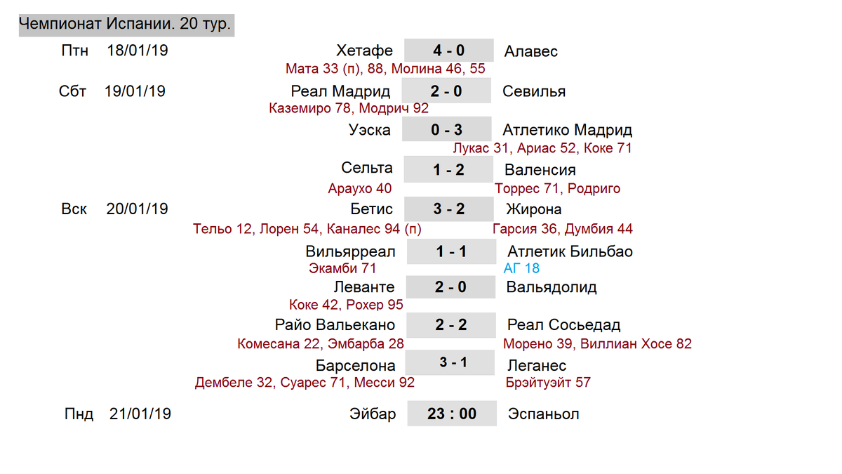 Футбол. Чемпионат Испании. Ла Лига. 20 тур. Результаты. Таблица. Расписание.