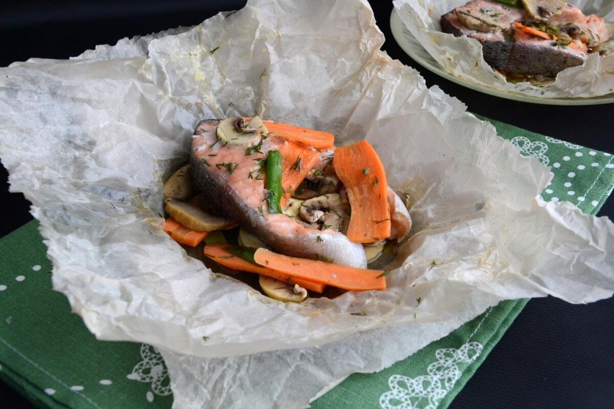 Форель в пергаменте с шампиньонами и морковью. Отличное блюдо!
