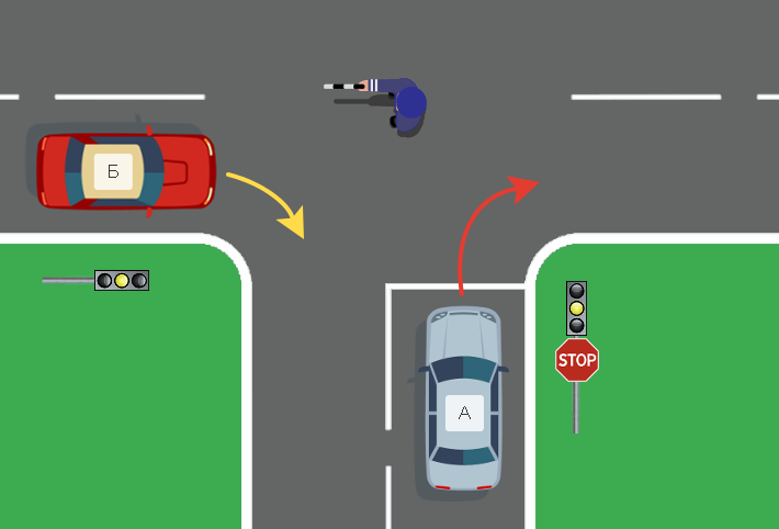 Регулировщик на перекрестке явление достаточно редкое. Поэтому многие водители просто забывают значение его жестов. Кто-то запоминает их наизусть, другие действуют по ситуации. К счастью, сотрудники ДПС, часто подсказывают водителям, как действовать на дороге и отступают от жестов указанных в инструкции. Условие: водителям необходимо проехать в указанных направлениях, движение на перекрестке организовано при помощи регулировщика. Вопрос: кому из водителей, согласно жесту регулировщика и показанным траекториям, разрешается продолжить движение? Варианты ответа: 1. Только водителю А 2. Обоим водителям 3. Никому Решение: правила подачи и требования жестов регулировщика подробно описаны в пункте 6.10 ПДД РФ. Светофоры и знак, установленный на перекрестке, теряют свою силу в пользу жестов сотрудника ГИБДД, даже в тех случаях, когда его жесты противоречат их требованиям (п. 6.15 ПДД РФ). К водителю «Б» регулировщик обращен грудью с вытянутой рукой вперед. Такой жест означает, что водителю ра