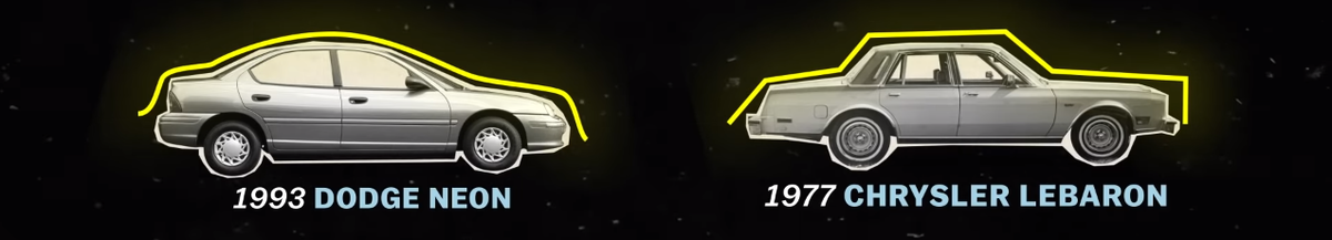 Если сравнить машины 1977 года и 1993, то вы увидите огромную разницу в дизайне. Они как-то быстро стали обтекаемыми и сглаженными. В чем же причина? Скругленные формы совершенно не были новой идеей в 90х. Еще в 1930х машины были обтекаемыми, это уменьшало сопротивление воздуха при движении. Но в 1960х они почему-то перестали хорошо продаваться, их потеснили большие угловатые машины. Цены на топливо в США тогда стабильно падали и об эффективности никто особо не задумывался. Так что к 1970 почти все машины в Америке стали угловатыми. И этот дизайн очень хорошо продавался в США, но в Европе топливо было намного дороже. Во Франции галлон топлива стоил 73,1 цента, в то время как в Америке всего 31 цент. Поэтому европейские дизайнеры стали пробовать более сглаженные формы, чтобы уменьшить расход топлива. В конце концов американские автопроизводители стали копировать европейский дизайн для привлечения состоятельных покупателей. Но в массмаркете все было иначе. Европейский дизайнер Форд Уве