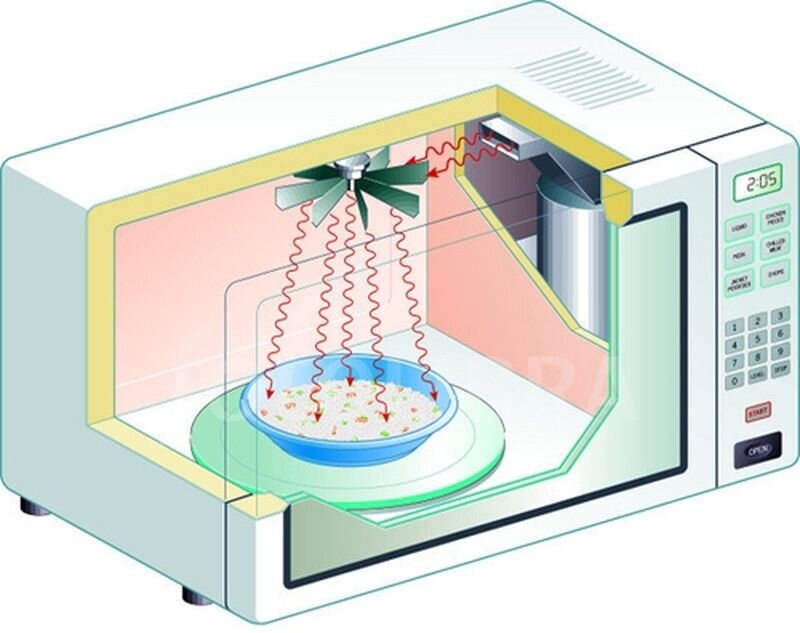 Под действием микроволнового излучения молекулы поворачиваются с бешеной частотой и трутся одна о другую. Выделяющееся при этом тепло и служит причиной разогрева пищи. Нагрев продуктов происходит за счёт прогрева микроволнами поверхностного слоя и дальнейшего проникновения тепла в глубину пищи за счёт теплопроводности.