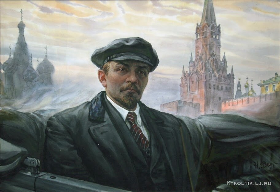 Николай Величко "Ленин на Красной площади" (1970) Картина вообще спланирована по композции очень хитро и имеет кучу несуразностей. Смотрим вместе: Во-первых, на ней аж 7(!) крестов. И это при том, что Ильич понятно как относился к религии. Во-вторых, Спасская башня заботливо обрезана сверху. Почему? А потому, что наверху на ней не звезда, а 2-главый орёл. Совершенно ненужный символ на такой картине. В-третьих, убраны все ненужные детали машины, в которой сидит вождь. Она только угадывается "в общем". Чтобы не отвлекала от созерцания главного объекта. В-четверых, щегольский галстук, как у Трампа или Рейгана. Это не вымысел, такой галстук есть на ленинских фото. В-пятых, за кремлёвской стеной отчётливо виден Четырнадцатый корпус, он же Школа красных командиров. Построен был в 1934-м году на месте снесённого Чудова монастыря, через 10 лет после смерти Ленина. Вот этот: И в шестых, отчётливо краснокирпичными стены Кремля стали только в 1947-м, до этого они были белёные.