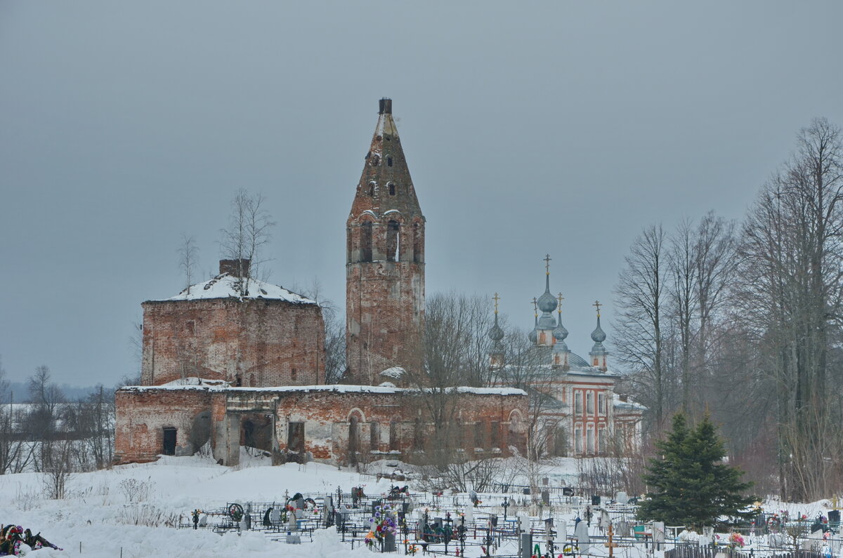 Непонятно, как так случилось, что село и погост оказались по разные стороны реки. Однако факт остается фактом - на одном берегу Юхоти расположилось село Леонтьевское, а на другом берегу - погост Леонтьевский. И как ни странно, село находится на более высоком берегу реки, чем церкви. Уже в первой половине XVI века на месте Леонтьевского погоста существовала деревянная церковь в честь «небесного покровителя» Ростовской земли епископа Леонтия, убитого язычниками в Ростове в 1071 году. В 1730 году она была заменена на каменную, позднее уже в 19 году была пристроена трапезная. Скорее даже перестроена из деревянной. Здесь нет высокого берега, или возвышения, но все равно церковь видна издалека благодаря колокольне. Эти ярославские "свечки" всегда вызывают у меня чувство восторга - устремленные ввысь, величавые даже в таком запущенном состоянии. Росписей внутри практически не сохранилось, жалкие остатки. Вторая церковь Леонтьевского погоста - Церковь Михаила Архангела, выстроенная в 180