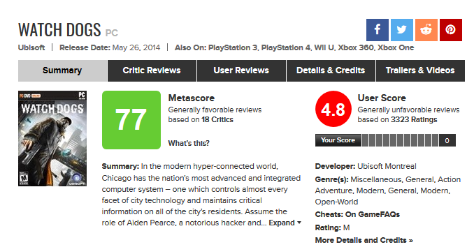 Знаете, первая часть знаменитого (читай - крайне раскрученного и распиаренного продукта, что в наше время далеко не редкость) Watch Dogs (досл. Смотрящие Псы) от Ubisoft была не просто плохой игрой. Она была ужаснейшим зрелищем обманутых и растоптанных в прах ожиданий, демонстрировавшим откровенно сырой, недоделанный, и, что самое главное, крайне пустой и скупой хоть на какое - нибудь содержание продукт. В данной игре был и ужаснейший сюжет про мстителя - одиночку, который будто за час написала группа школьников лет тринадцати, любящих по выходным смотреть дешёвые фильмы про "крутых хакеров", крайне унылые взломы, где нужно было из раза в раз мучиться с клавишами на клавиатуре/ геймпаде, стремясь побыстрее подключиться к очередному девайсу очередного безликого болванчика и скучнейший геймплей, являющийся крайне плохой копией знаменитой GTA. Всё было настолько плохо, бедно и откровенно серо, что даже оценки первой части на сайте Metacritic до сих пор не смогли подняться выше условного 4 из 10 ( и то, для такого откровенного позора современной игровой индустрии такие оценки, на мой взгляд, ещё достаточно сдержаны, лично я бы ей после ровно одного полного прохождения не дал бы и нуля).
