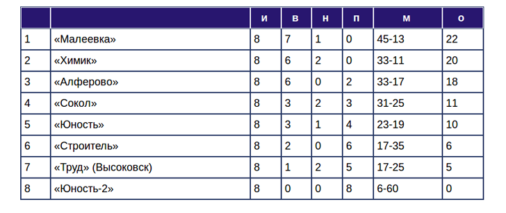 В первенстве Клина начался второй круг. На его старте зафиксирован, как минимум, один неожиданный результат. «Химик» потерял очки в игре с «Трудом», вследствие чего, «Малеевка» стала единоличным лидером. Результаты матчей 8-го тура: «Труд» – «Химик» 3:3, «Малеевка» – «Юность-2» 4:0, «Сокол» – «Строитель» 6:5, «Юность» – «Алферово» 3:4. Дмитрий Кириллов