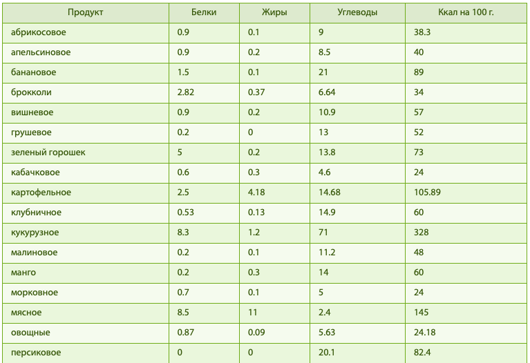 В данной таблице вы можете узнать сколько калорий в детском пюре, кашах, смесях и другом детском питании. ПЮРЕ Онлайн Калькулятор калорийности продуктов Онлайн Калькулятор БЖУ и суточной нормы калорий РАЗНОЕ Более подробные Таблицы калорийности и БЖУ продуктов смотрите тут Чтобы не пропустить другие интересные статьи подписывайтесь на канали конечно же жмем справа палец вверх!!!