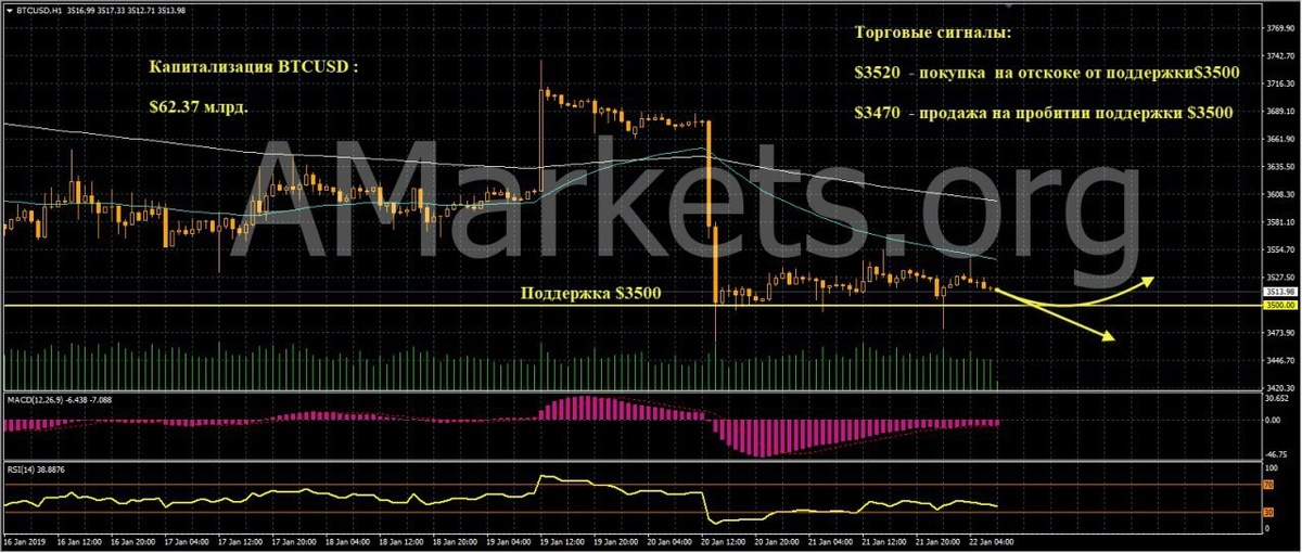 BTCUSD: Биткоин продолжил консолидацию над поддержкой $3500. В то же время бычье схождение в индикаторе MACD усиливается, что говорит о возможности отскока вверх. В таком случае покупаем BTCUSD, начиная с отметки $3520. Скользящие средние ЕМА200 и ЕМА50 продолжают давить на монету. Если Биткоин пробьет поддержку $3500, входим в короткие позиции по цене от $3470.