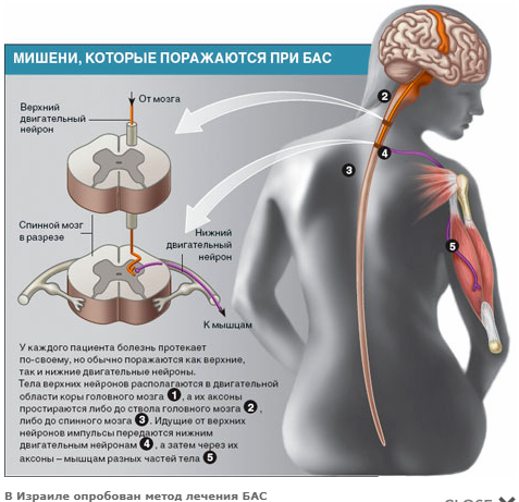 БАС – боковой амиотрофический склероз, он же болезнь Шарко, является заболеванием центральной нервной системы. При БАС поражаются верхние и нижние двигательные нейроны, в результате чего развиваются параличи и атрофия мышц. БАС является дегенеративным, медленно развивающимся заболеванием. При БАС больные умирают вследствие того, что отказывает дыхательная мускулатура, или же развиваются инфекции дыхательных путей. БАС считается неизлечимым заболеванием, однако израильским ученым-биотехнологам, возможно, в скором времени удастся изменить эту ситуацию. Как сообщает израильская ивритоязычная пресса, и в первую очередь, «Ядиот ахронот», израильские биотехнологии применили для лечения БАС стволовые клетки, которые были забраны из костного мозга человека, страдающего БАС. На протяжении месяцев, данные клетки обрабатывали особым образом, применяя инновационные лабораторные технологии, а затем снова «отправляли» в организм больного БАС – либо внутримышечно, в случае, если заболевание находил