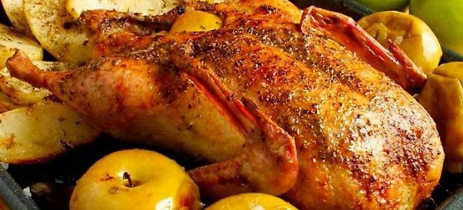 1. Целого потрошеного гуся натереть снаружи и изнутри смесью соли, перца и половины головки измельченного чеснока.