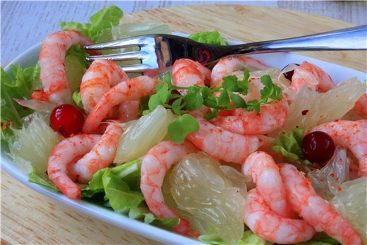 Помело относится к семейству цитрусовых. Этот зеленый фрукт по вкусу напоминает грейпфрут – кисло-сладкий с оттенками горечи. Польза помело Благодаря своему богатейшему составу, помело способен оказывать лечебный эффект. Фрукт содержит: ⦁ множество витаминов; ⦁ эфирные масла; ⦁ микроэлементы; ⦁ антиоксиданты; ⦁ бета-каротин. Экзотический фрукт помогает в борьбе с простудными заболеваниями, укрепляет сердце и сосуды, повышает иммунитет. Это самый настоящий природный антидепрессант – вкусный и невероятно полезный! Рецепты салатов из помело Мякоть помело часто применяется для создания различных салатов. Получаются вкусные, полезные и низкокалорийные блюда, так что всем, кто следит за фигурой, стоит непременно включить этот фрукт в свой рацион. Помело гармонирует с фруктами и ягодами, имеющими сладкий вкус, и другими цитрусовыми. Также его добавляют в салаты из овощей, мяса и морепродуктов. Салат с креветками Понадобится: ⦁ 1 помело; ⦁ 200 г креветок; ⦁ салатные листья; ⦁ сок половины лимо