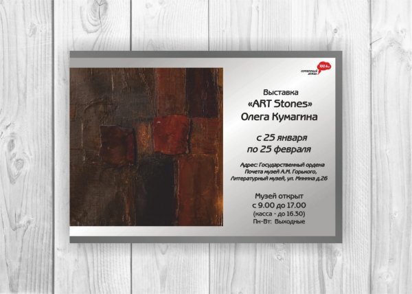 25 января 2019 года в 18:00 в Государственном музее А.М.Горького откроется выставка, демонстрирующая новое направление - «ArtStones». В этой технике на холсте комбинируют краски и камень. Сначала камень клеится на холст, а потом идут в ход краски, с учетом индивидуальности камня, часто - полудрагоценного. Автор работ - нижегородец Олег Кумагин- опытный путешественник. Многие камни, использованные в работах, он нашел сам. Некоторые его работы уже выставлялись в США и получили высокую оценку. На выставке покажут 30 работ, часть из них посвящена творчеству Максима Горького. Адрес: улица Минина, дом 26. Вход на открытие свободный.