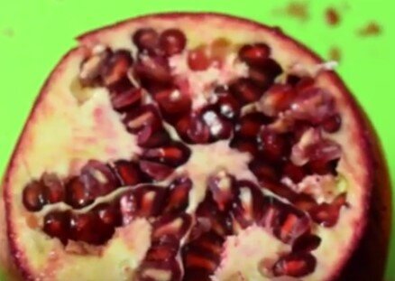 Для того, чтобы быстро очистить гранат сначала надрезаем верхушку и осторожно снимаем ее рукой. Видим, что гранат разделен на секции - это белые продольные перепонки. Теперь назрезаем кожицу граната параллельно этим переронкам. И затем руками аккуратно разделяем его на дольки. Получаются дольки как у апельсина. И теперь гранат легко очистить от пленочек и шкурки. Зернышки получаются целые, сок не потек.