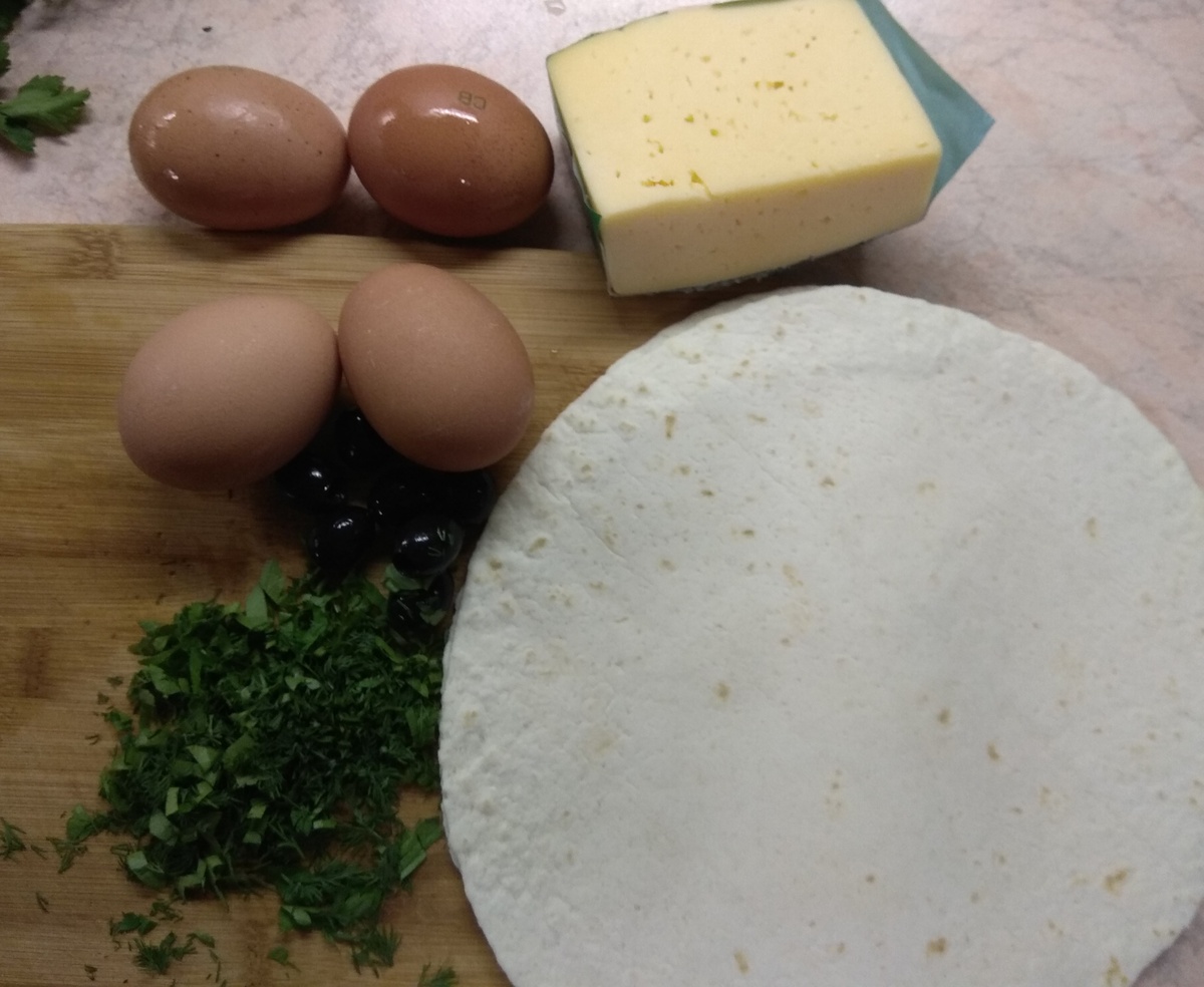 Доброе утро, жители планеты! Кто-то скажет :"Утро добрым не бывает!". А у меня оно всегда доброе! Оговорка: только если не болеют дети! А в остальных случаях - ЖИЗНЬ ПРЕКРАСНА В ЛЮБОЙ СИТУАЦИИ! Сегодня проснувшись, надо было быстро сделать завтрак. Взгляд мой упал на оставшиеся два коржа тортильи. (в предыдущем посте я о нем уже рассказывала) Обычно это блюдо я делала с лавашом, но сегодня решила : О! Тортилья! Будем спасать! Через пару дней, открытый пакет с тортильей засыхает. Итак, берем: * Два листа тортильи( лаваша) * 4 яйца (думаю, и меньше тоже подойдет) * Сыр твердый грамм 100 (как вариант, можно и по типу Моцареллы) В дополнение, если хотите: * Зелень * Маслины (оливки) * Помидоры (тонкими кружочками) --Варианты можно (и нужно) экспериментировать. Начинаем " сборку" : Тортилью или лаваш нужно обрезать по форме сковороды (ножницы Вам в помощь - лучше всего) На сухую сковородку положить лист тортильи (лаваша) и разбить по одному 4 яйца. Даже, если растекся желток,