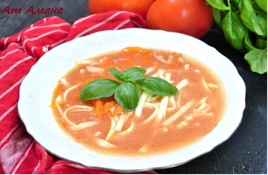 Рецепт вкусного томатного супа с помидорами из банки и лапшой. Ингредиенты · 5 куриных крылышек · 2 моркови · петрушка · сельдерей · лука-порея · лук · пол банки помидоров · 3 чайные ложки томатной пасты · столовая ложка сметаны 18% · 5 зерен душистого перца, 4 лавровых листа · соль, перец · любая любимая вермишель Приготовление Крылья залить 2,5 л воды, добавить душистый перец и лавровый лист. Даем закипеть. Собираем «накипь», добавляем очищенную морковь, петрушку, сельдерей и лук-порей, очищаем лук, режем пополам и обжариваем на сухой сковороде. Также добавьте в бульон и варите, пока крылья и овощи не станут мягкими. Приправить. Уберите овощи и крылья с бульона. Я его перецеживаю, но это не обязательно. Морковь и петрушку натереть на мелкой сетке, очистить мясо от костей. Снова добавляем их в бульон вместе со смешанными помидорами. Варить на медленном огне около 10 минут, затем добавить томатную пасту и специи по вкусу. Выключите огонь, сметану с горячим бульоном перемешиваем, за