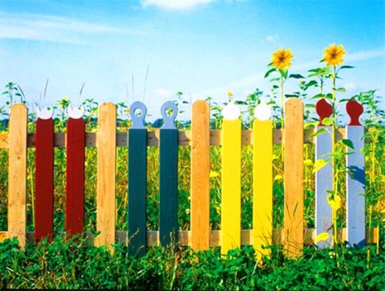Красиво оформленный забор — изюминка в декоре любого участка. Его покраска — это отличный способ снова почувствовать себя ребенком с кисточкой и гуашью, а также безграничной фантазией. Все зависит от вашего вкуса: если вы поклонник минимализма, вам стоит выбрать один цвет для всего ограждения, но не забывайте, что даже в таком случае можно сделать забор необыкновенным. Выбирайте яркие оттенки, сажайте рядом цветы или вместо краски используйте зеркальную пленку. Ваш участок станет невидимым! Если же вам нравится буйство оттенков, и вы против всего незамысловатого, вы можете рисовать целые картины на вашем заборе или подбирать несколько подходящих друг другу оттенков и чередовать их в произвольном порядке, рисовать узоры и превращать самую обычную деревяшку в клавишу пианино или карандаш. Чтобы правильно подобрать краску воспользуйтесь этой таблицей. Вот несколько наглядных идей по сочетанию цветов и росписи усадебных заборов для вашего вдохновения! Хотите больше оригинальных идей и по