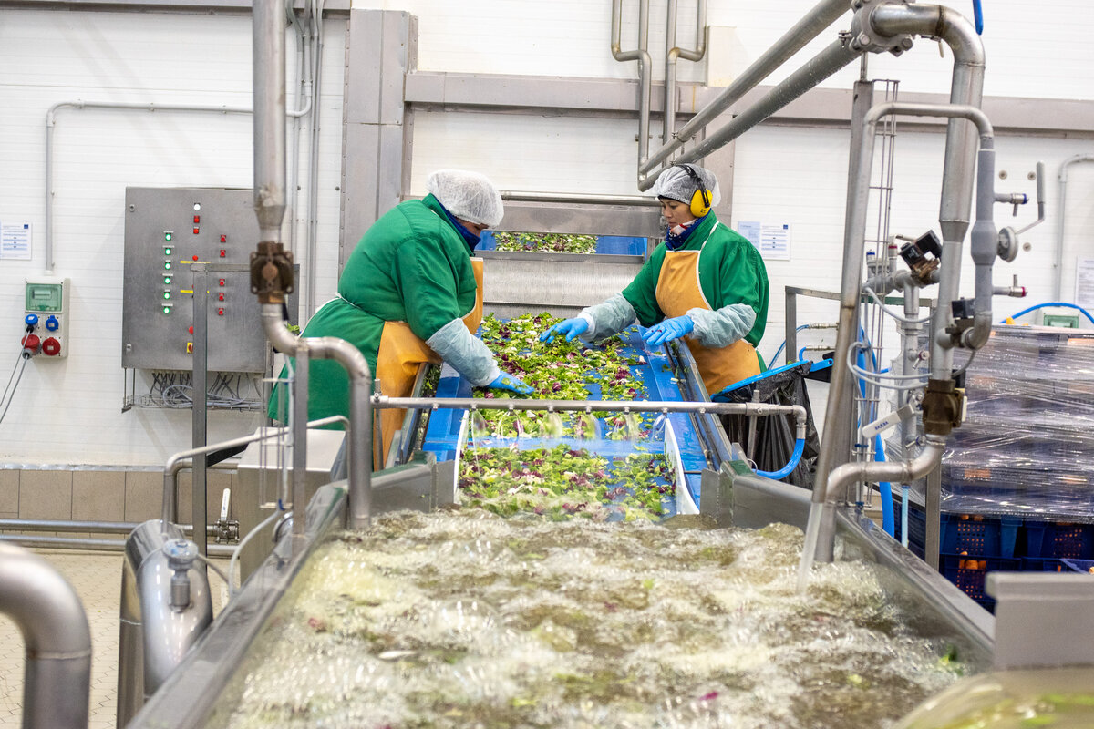 Осенью довелось побывать на производстве "Белая Дача" в Москве, где делают те самые салаты для Макдональдса и других торговых сетей. На производстве стерильный режим, в цех можно зайти только в специальном костюме и после дезинфекции. У "Белой Дачи" есть свои агрокомплексы, но их мало. Большую часть продукции приходиться закупать у других поставщиков. В первую очередь все овощи проходят ручную обработку. Убирают испорченные листья и разделяют кочаны салата на части. Часть цеха с высоты, видны сушки и системы оптического контроля. Затем овощи моют. Самое дорогое на производстве - это вода. Она тут проходит несколько степеней очистки. Затем сортировка. В момент сортировки салаты проходят оптический контроль, все плохие овощи сдувает струя воздуха. Есть даже металлоискатель, чтобы в салаты не попали какие-то металлические предметы. Затем салаты упаковывают в коробки и отвозят в точки реализации.