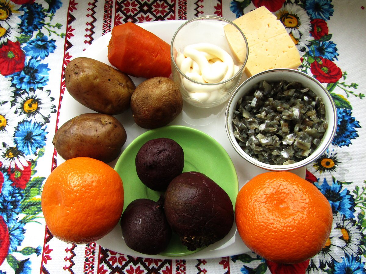 На праздничный стол можно приготовить вкусный и сытный салат, который имеет на нижнем ряду слабосоленую рыбку. Все остальные верхние слои делаем из отваренных овощей, которые смазываем майонезом. Верхний слой состоит из тертого твердого сыра и оливок, а вот серединка – из мандаринов.